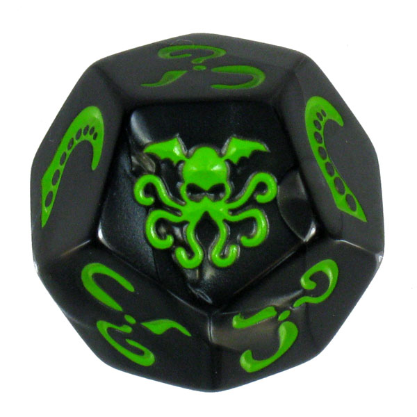 In my first conception, the game had two identical dice – one for the attacker, one for the defender. I quickly realized, "Whoa, if they're identical, why have two?" So we cut it down to one die, and made it a big one. We ended up offering the Cthulhu die in four different colors, because we could . . . plus two glow-in-the-dark variants that we sell only in Warehouse 23.