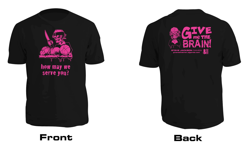 With zombie art by Brian Snōddy imprinted in hot pink on classic black, the Give Me The Brain Shirt is great for game night . . . or for anyone who still has nightmares about what happened over by the deep fryer.
