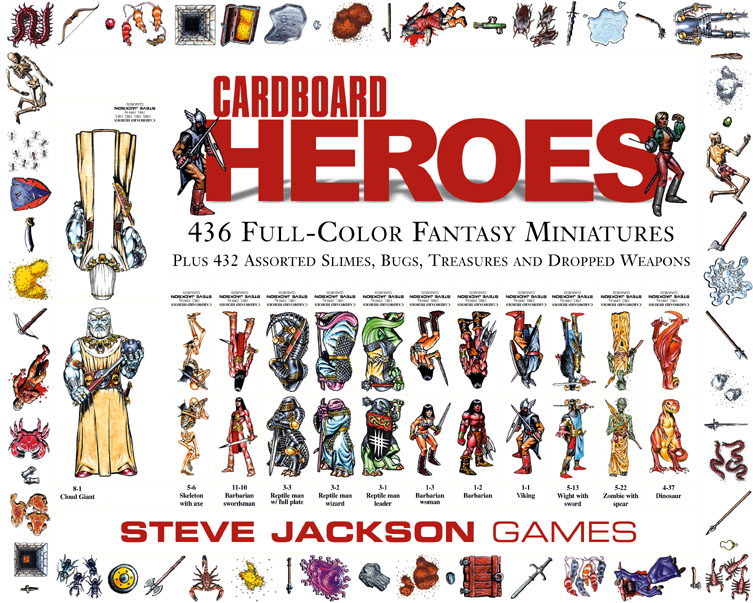Out Of Print – Click here for dealer infoAn often-requested reprint is our Cardboard Heroes line . . . beautifully drawn full-color stand-up figures. Much cheaper than miniatures, and more convenient too! We have reissued all 13 sets of fantasy-themed Cardboard Heroes in one pack, and adding duplicates of some of the "cannon-fodder" figures like orcs and undead. Over 400 stand-up figures, plus over 300 flat counters for traps, dropped weapons, creepy crawlers and the like!