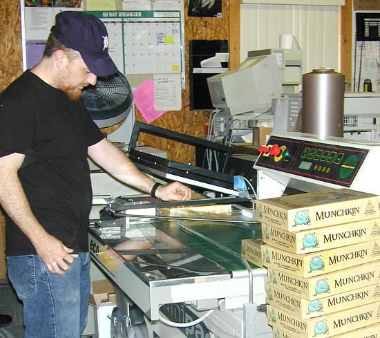 A couple of months ago our shrinkwrapper died for the last time. I shall not burden you with the story . . . with any of the stories . . . of the living hell that we went through to get the replacement delivered or properly installed, or the Sisyphean efforts of the guys down in Traffic to feed the insatiable maw of worldwide Munchkin fandom with only the small shrinkwrap system kindly loaned by Phil Reed.But it wasn't pretty.