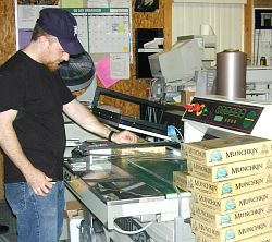 However, it is, finally, working, and THAT is very pretty indeed. It's highly automated. You put boxes in one side, and they move quickly through, and the bar comes down by itself and the boxes come out the other side. Much faster and more efficient. Here's John Northrup feeding it stacks of Munchkin. |