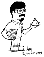 - This is me grinning like a loon in my new Schlock Mercenary T-shirt. When we got there Thursday, the first person I ran into was Howard Tayler, and he gave me this. We got to spend some actual quiet time talking. Neat. Later in the con, he drew some great caricatures of the guests, and here's the one he did of me!