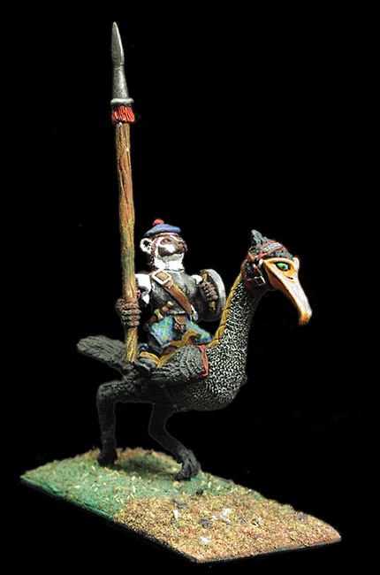 In addition to infantry, some Highlander clans maintain a small bird-mounted cavalry unit, used primarily for patrolling their borders. This is an individual Highlander Badger Heavy Cavalry Lancer, including mount.