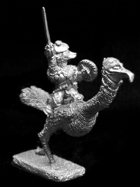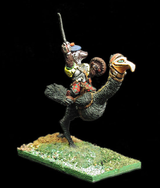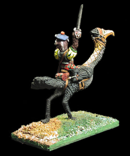 In addition to infantry, some Highlander clans maintain a small bird-mounted cavalry unit, used primarily for patrolling their borders. This is an individual Highlander Badger Heavy Cavalry Officer, including mount.