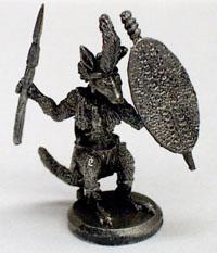 An individual Zuluroo. The Zuluroos are based on the Red Kangaroo, with a culture from the Tribal Zulu, mid to late 1800s. The Zuluroos are much darker furred than their genetic ancestors, in keeping with their Pseudo-culture. They organize militarily into historical Zulu regiments, though with some slight alterations in the names such as the umBouceambi. Fond of boxing as a sport.