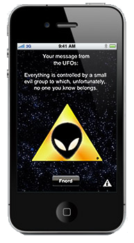Our first iPhone project. It's free! We created it for practice, for fun, and to further the plots of the Secret Masters. The Fnorder brings you messages from the Illuminati . . . encoded information and instructions for world conquest, for your eyes only. This is all for real! Honest!